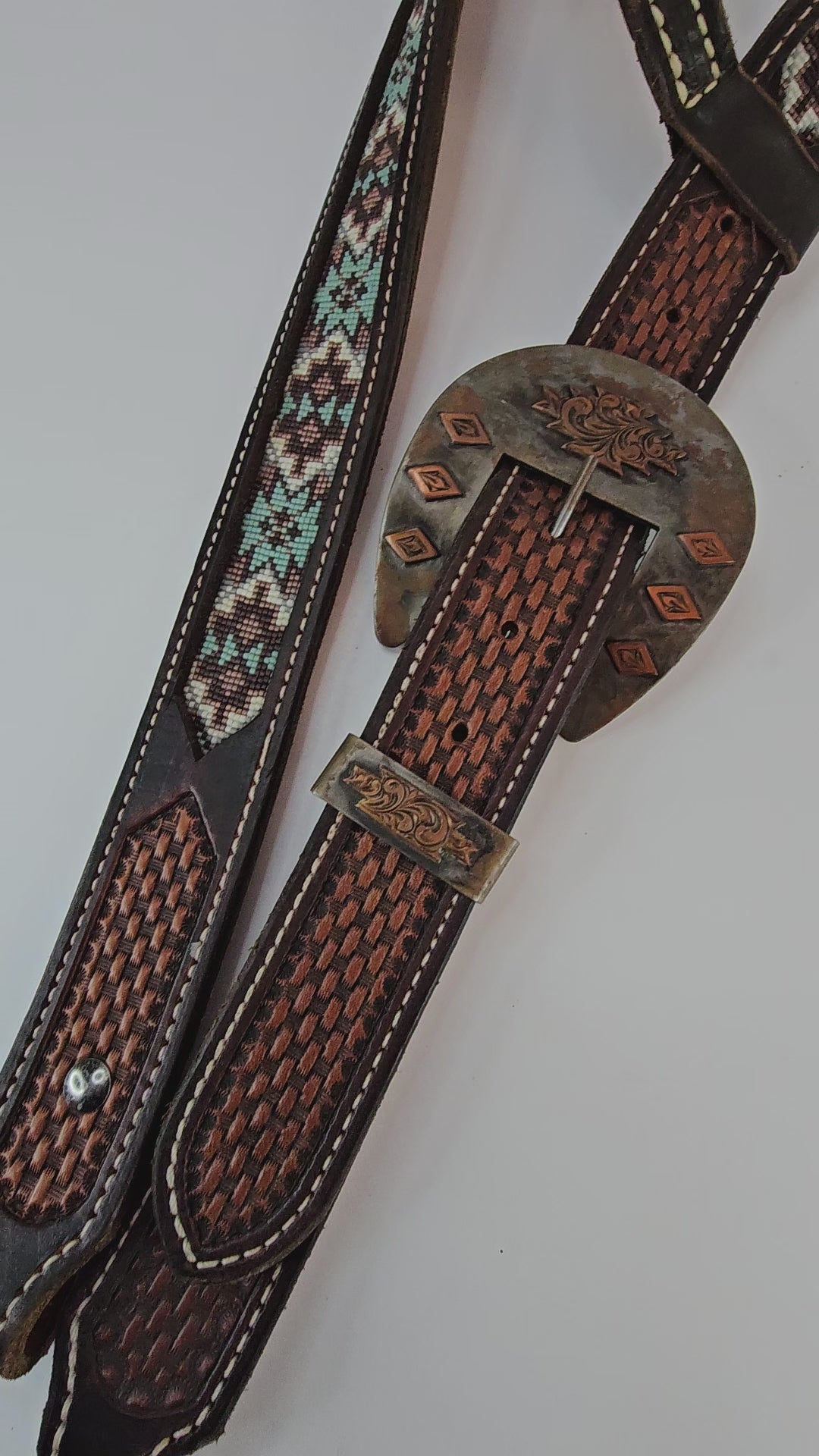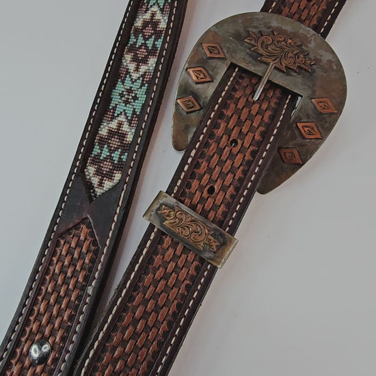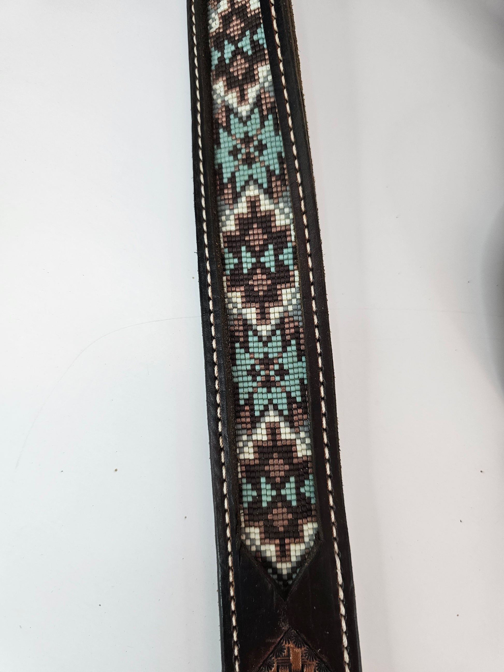 Turn heads in and out of the arena with the Desert Jewel — a handcrafted leather single ear headstall that blends western tradition with bold, beaded artistry. Featuring an intricate pattern of turquoise, copper, and rich brown beads, this piece radiates Southwest charm. The handmade engraved buckle and keeper add a one-of-a-kind finish, making this headstall as functional as it is stunning. Built for performance, designed to stand out.