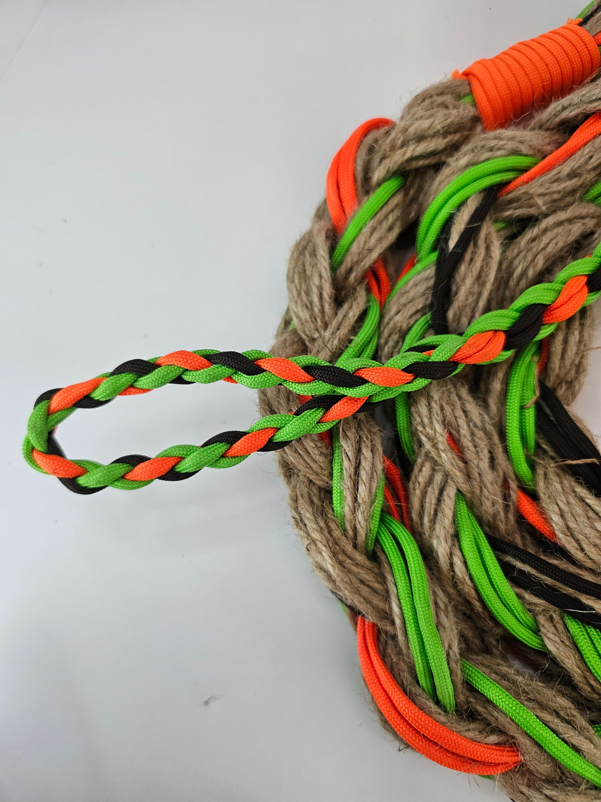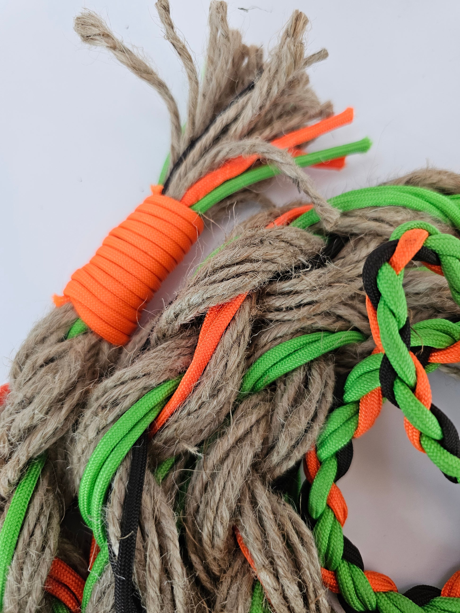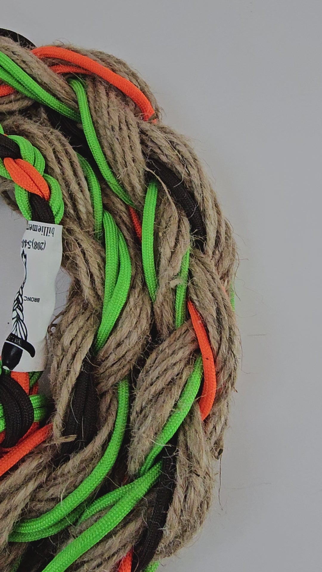 Jungle Trouble is wild from the first nod. This rein throws heat with bright orange and electric lime green, grounded by deep, dark brown and finished with a classic tan jute handle. It's bold, punchy, and made for riders who bring chaos to the chute. Whether you're just starting out or chasing the buckle, Jungle Trouble is built to turn heads and hold strong.