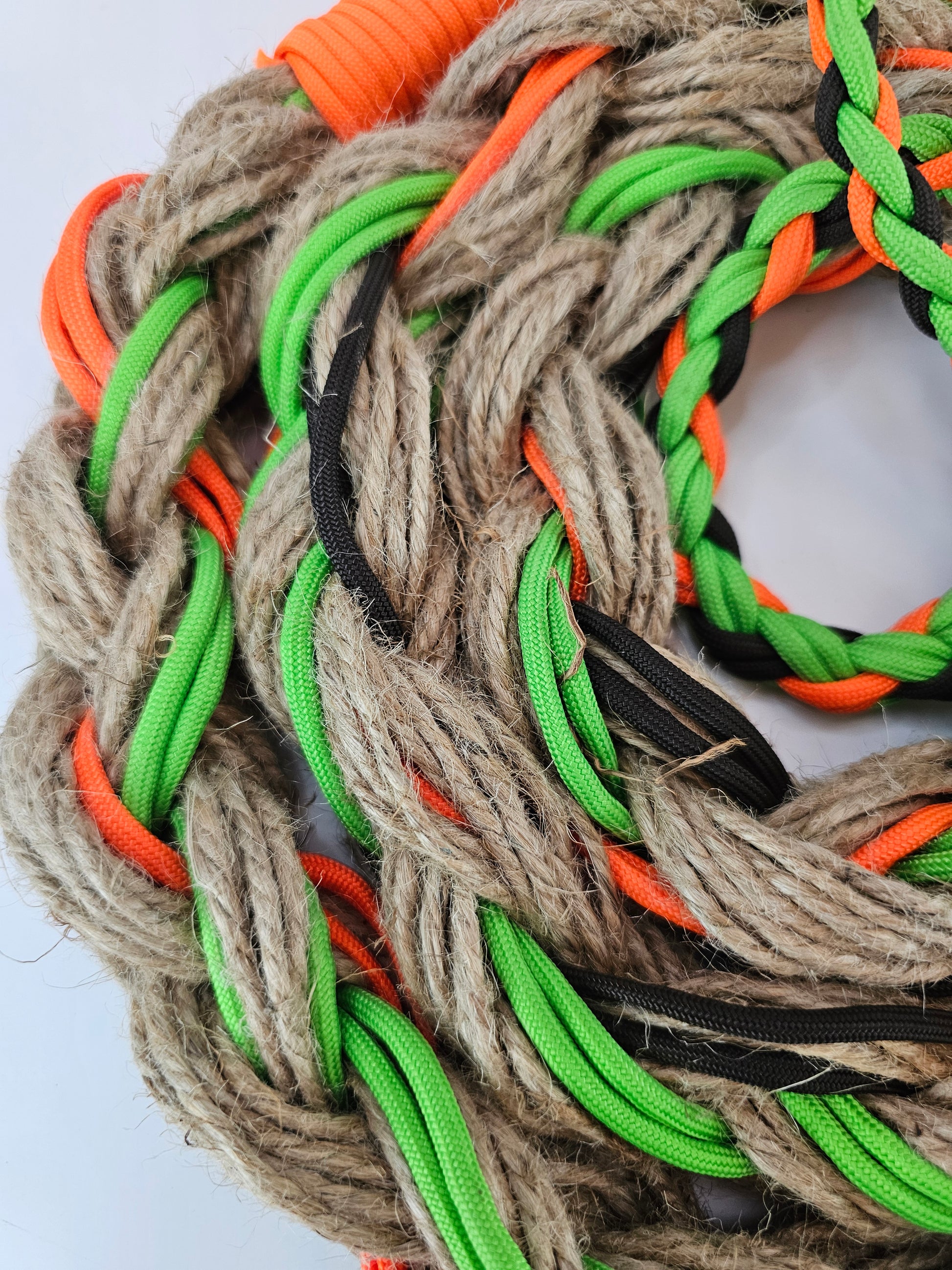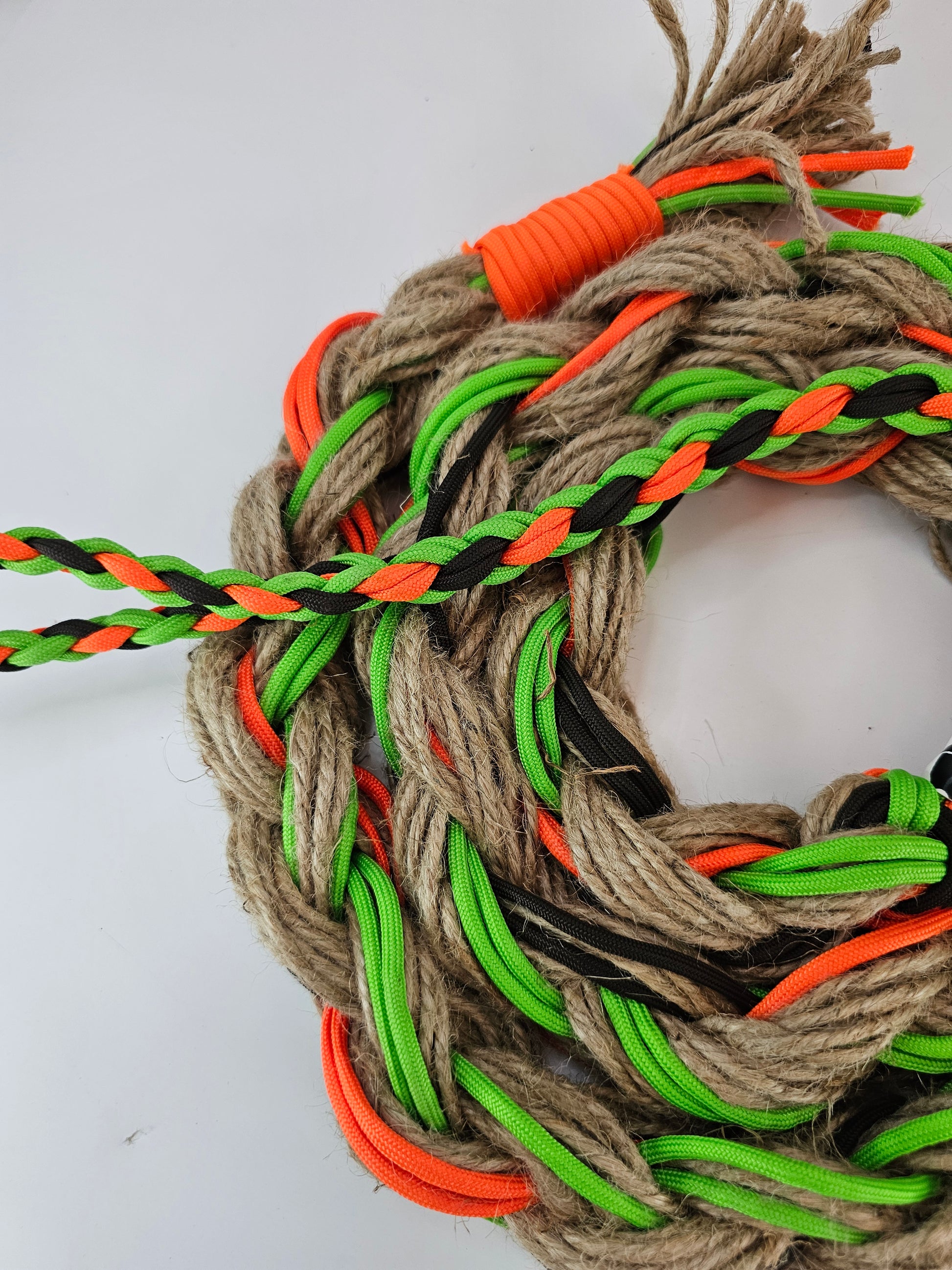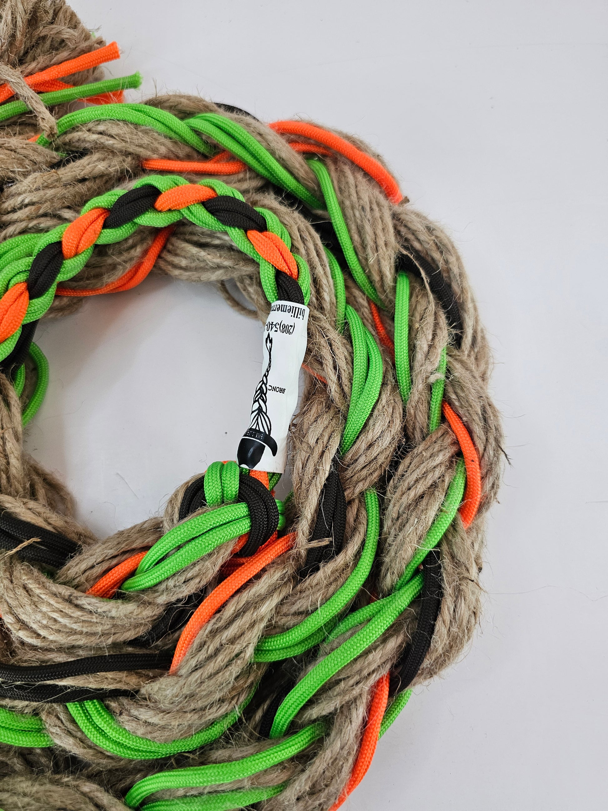 Jungle Trouble is wild from the first nod. This rein throws heat with bright orange and electric lime green, grounded by deep, dark brown and finished with a classic tan jute handle. It's bold, punchy, and made for riders who bring chaos to the chute. Whether you're just starting out or chasing the buckle, Jungle Trouble is built to turn heads and hold strong.