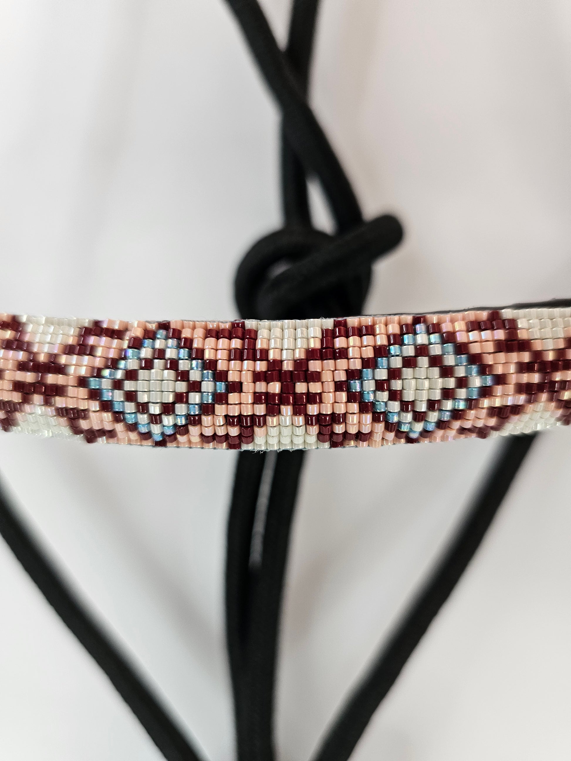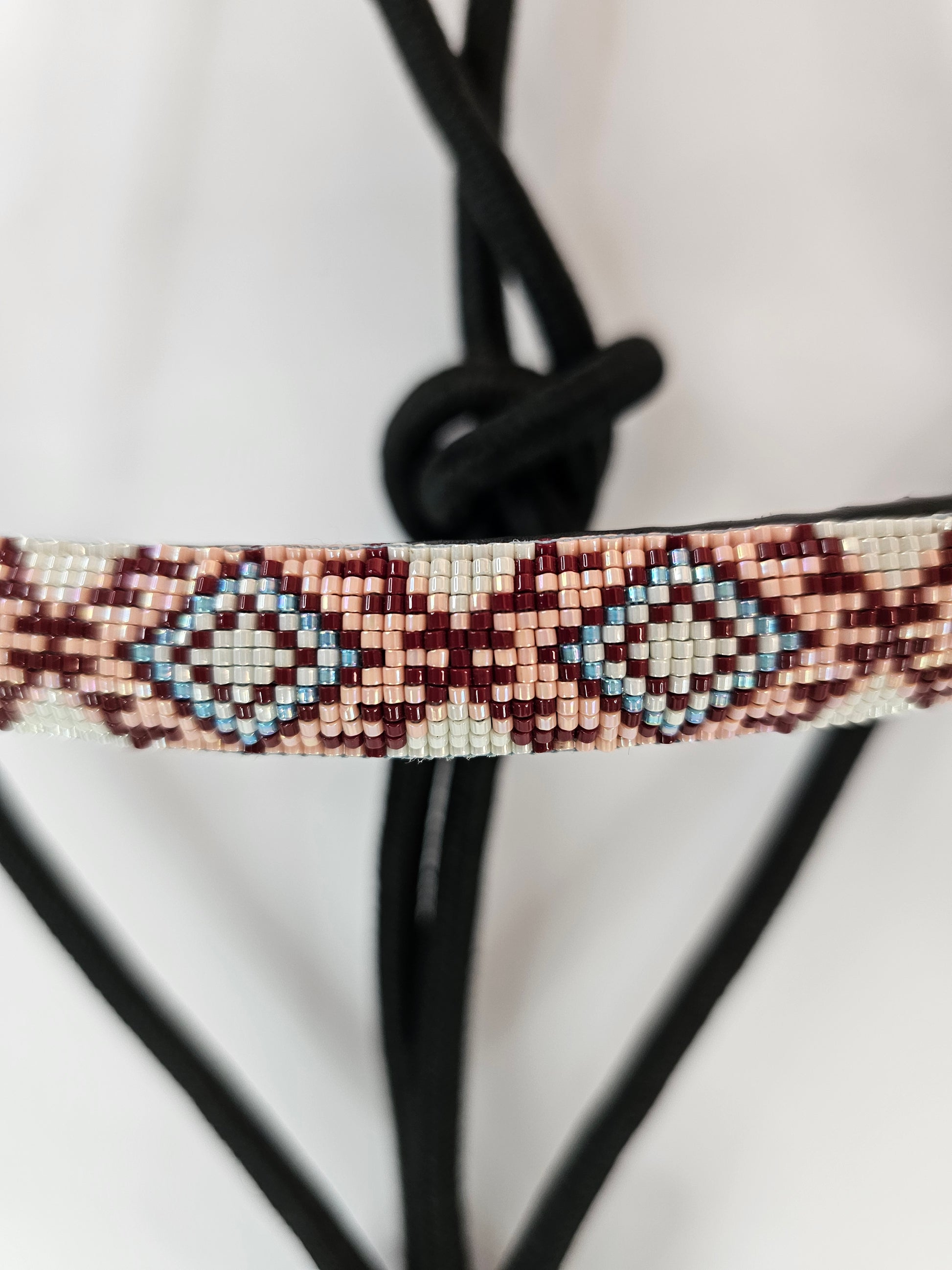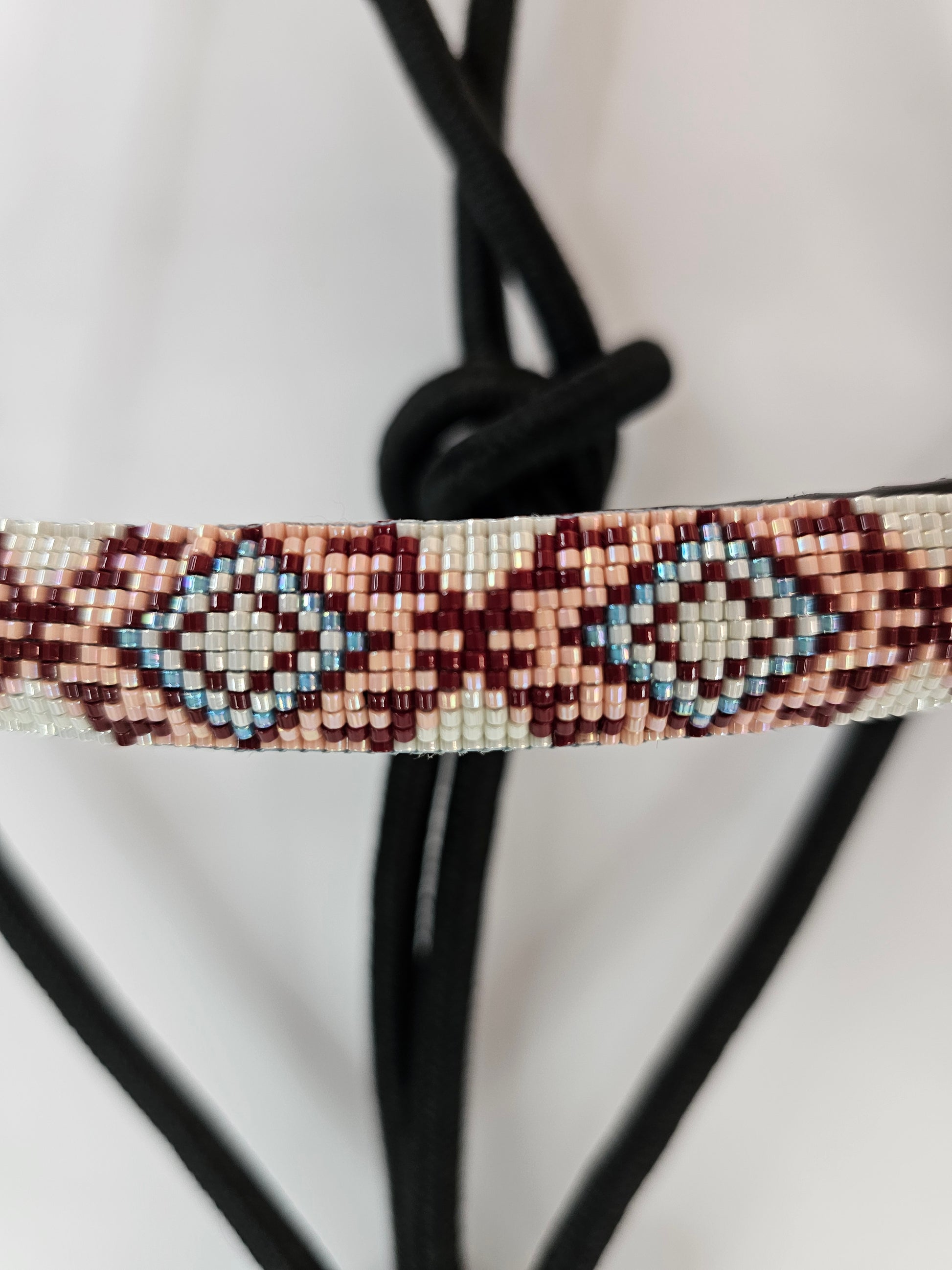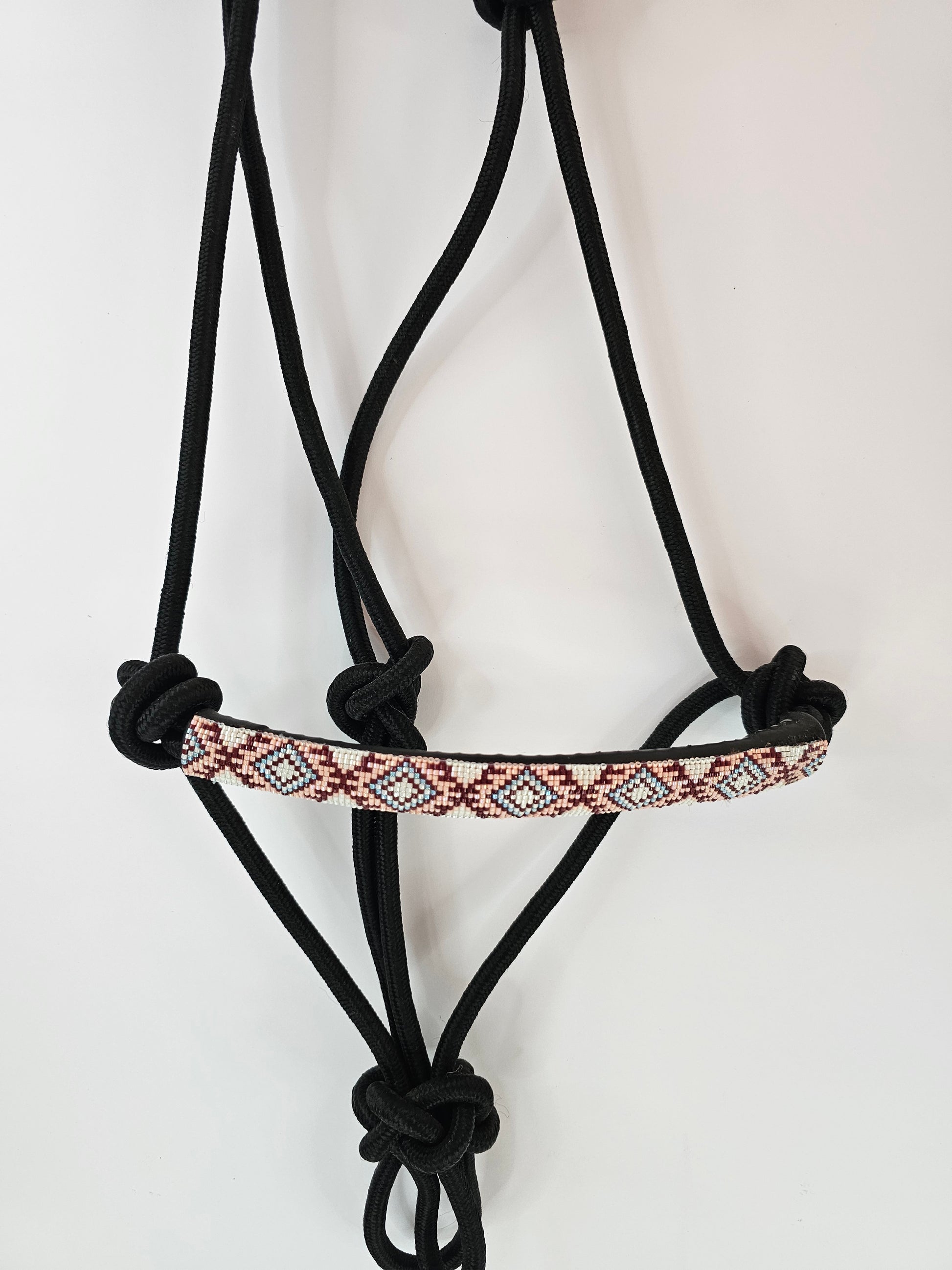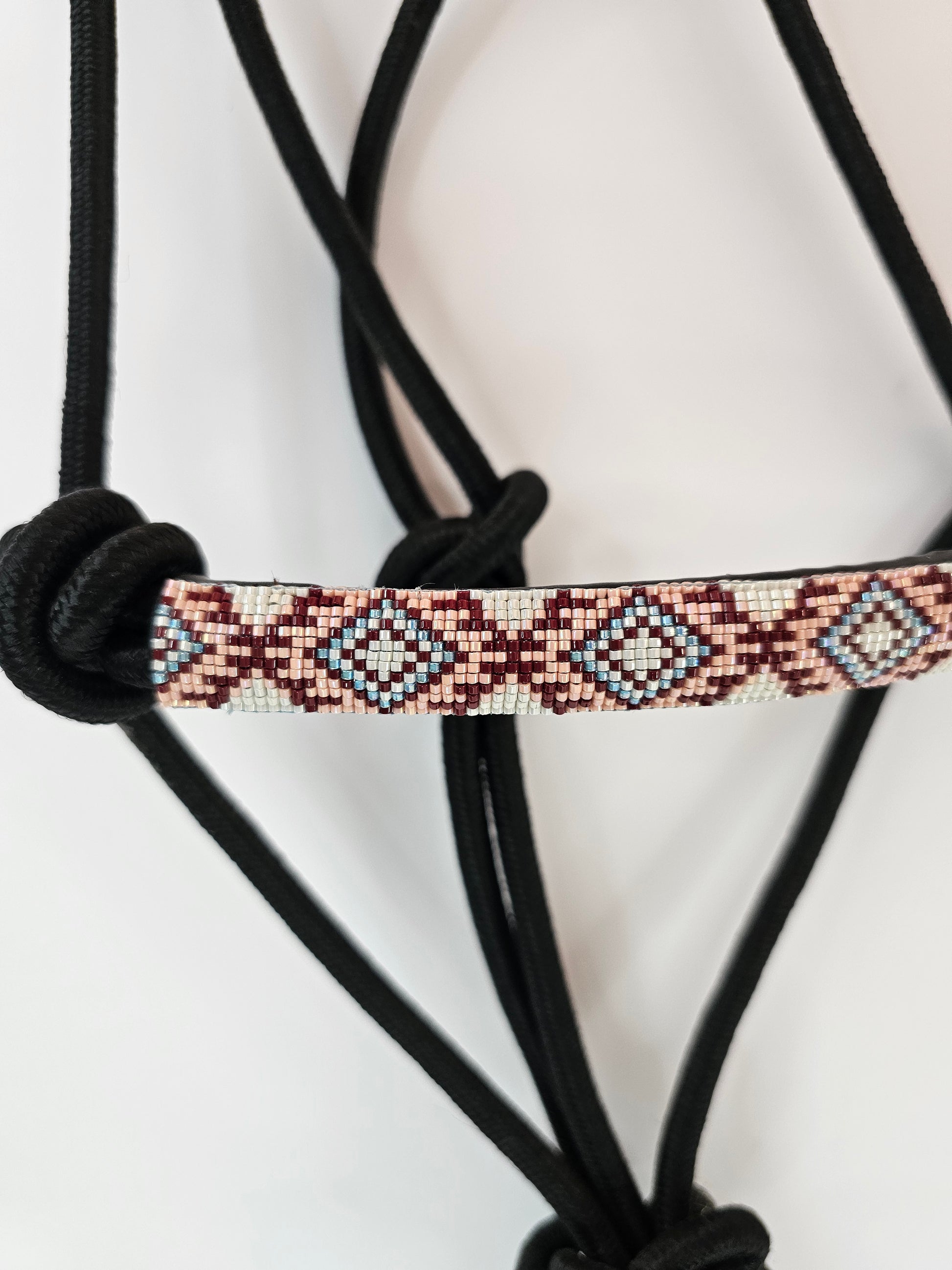 The Rose Dust rope halter brings a perfect blend of grit and grace. Crafted from durable black rope and finished with a hand-beaded noseband in shades of maroon, soft pink, and light blue, this halter is where functionality meets flair. Whether you're working on the ground or just want your horse looking sharp, this halter adds a soft pop of color with a western edge.